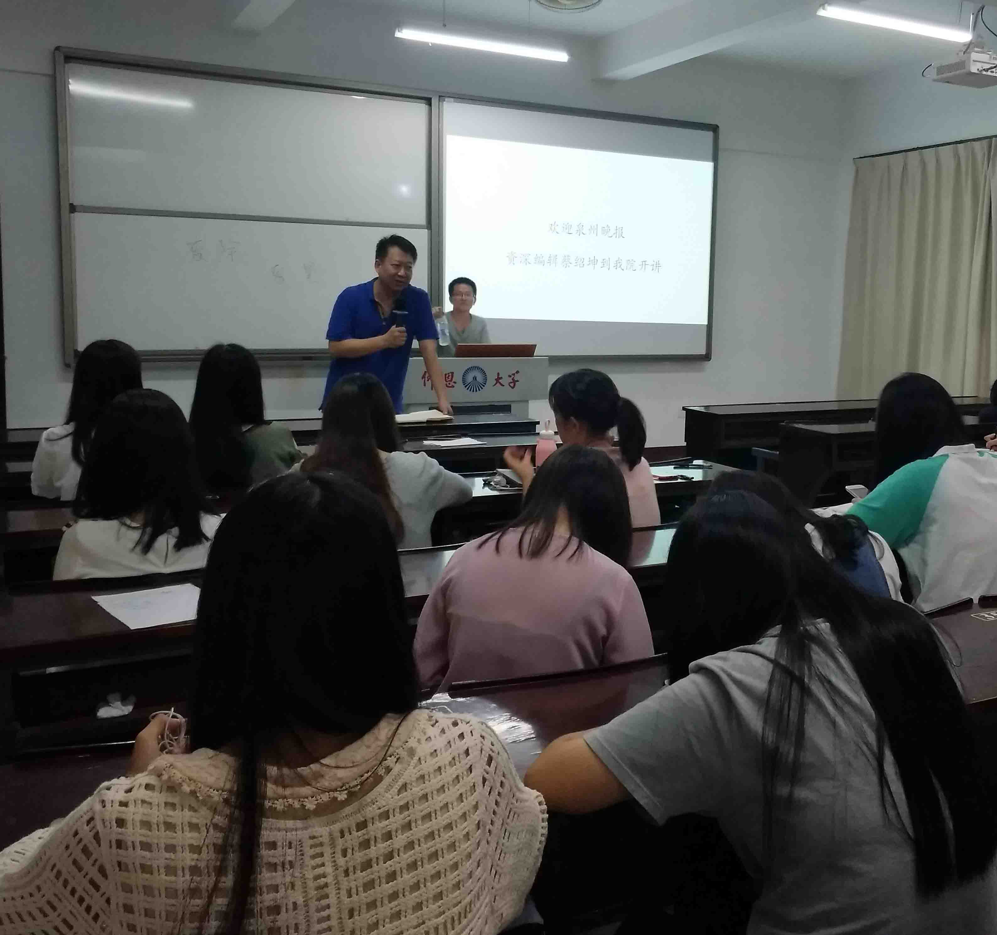 6月22日,williamhill英国官网业界老师,泉州市广播电台副台长,高级记者黄永超教授的开放课堂“新媒体导论”邀请泉州晚报资深编辑蔡绍坤老师为同学们讲解当下新媒体实战。按照williamhill英国官网业界导师开放课堂的要求,全校其他任何专业的感兴趣的同学都可以到第三教学区仰恩楼C4-305教室旁听。
