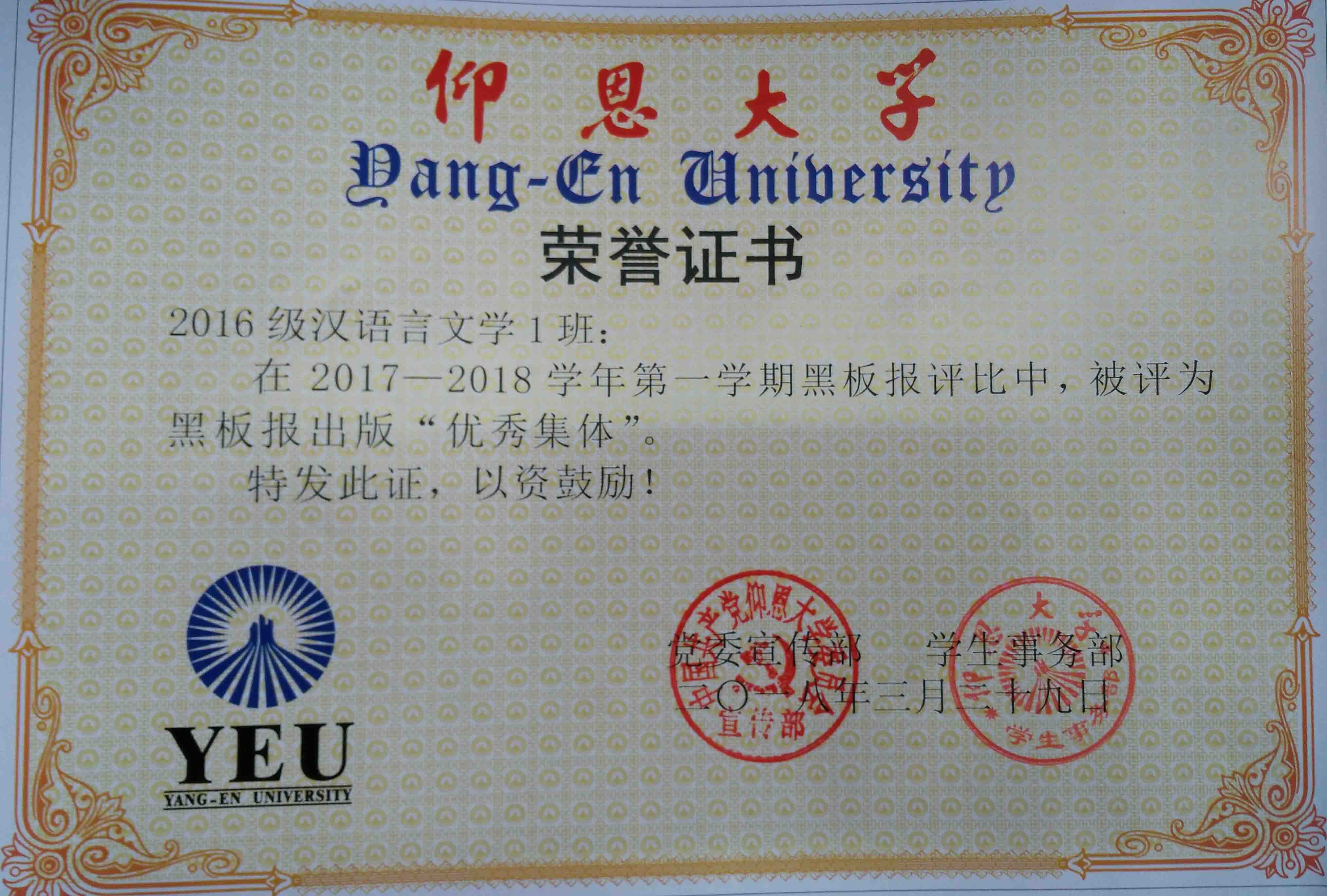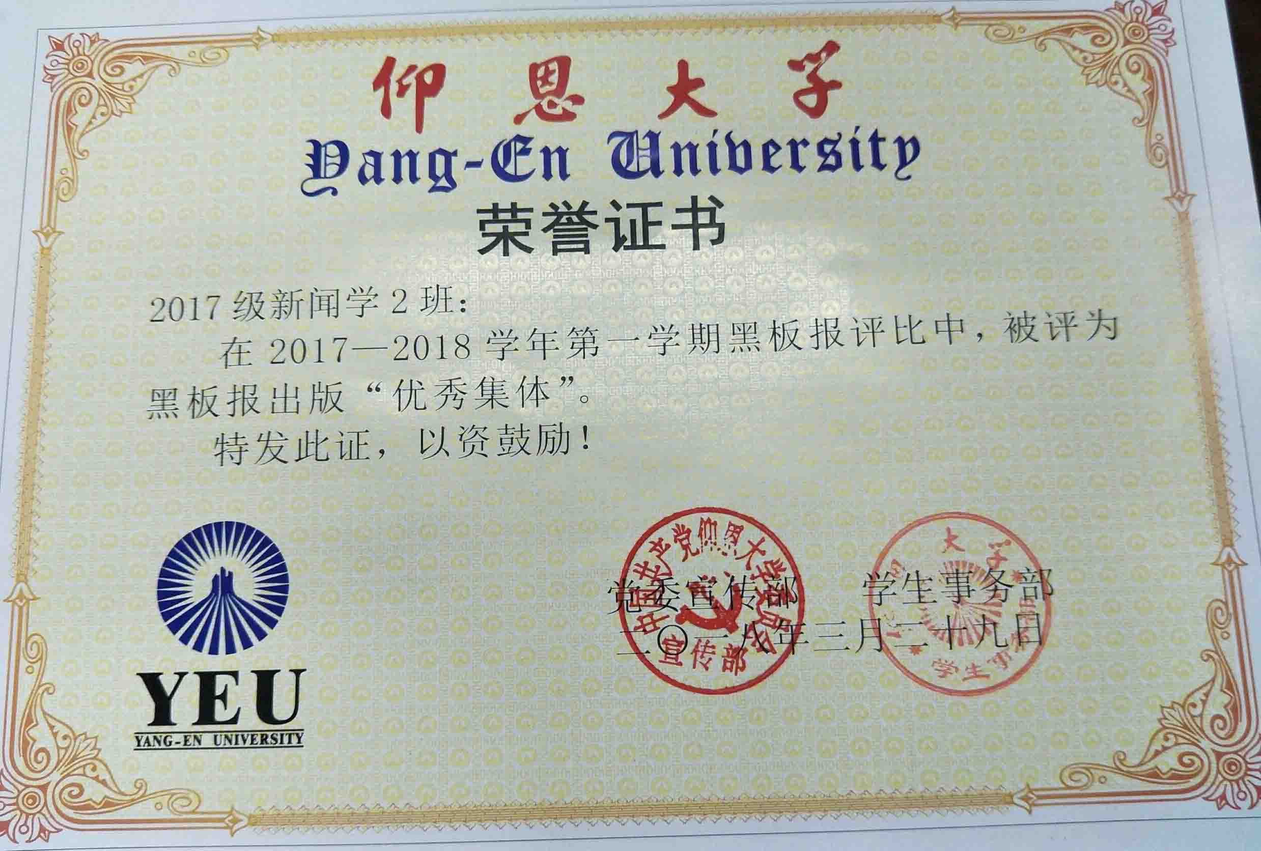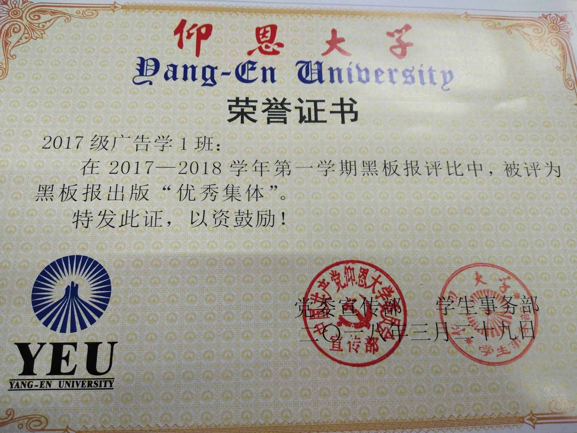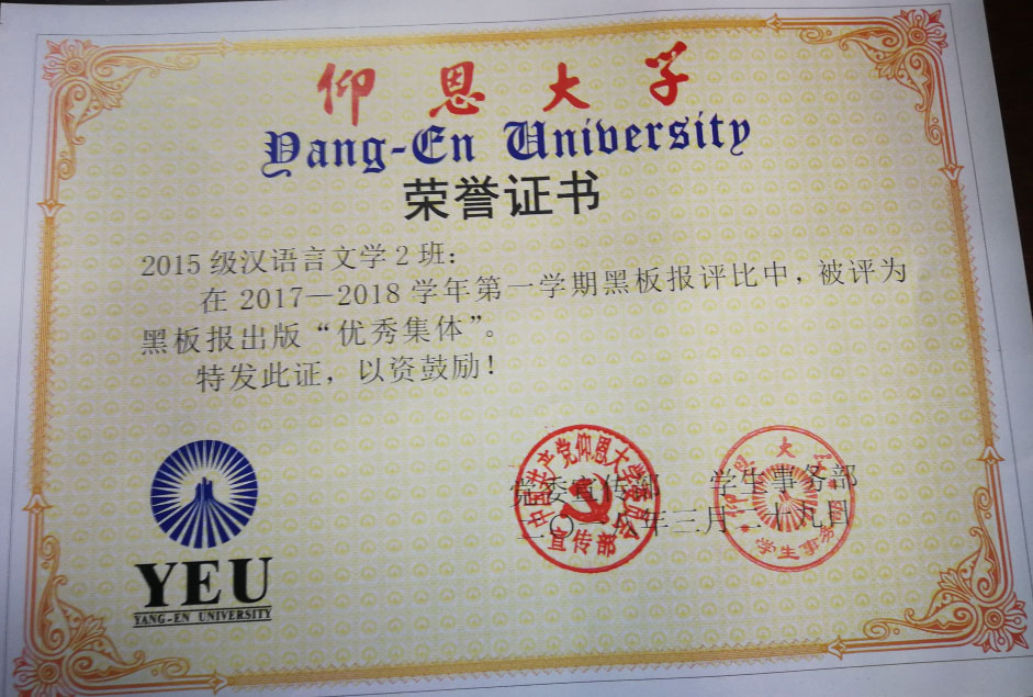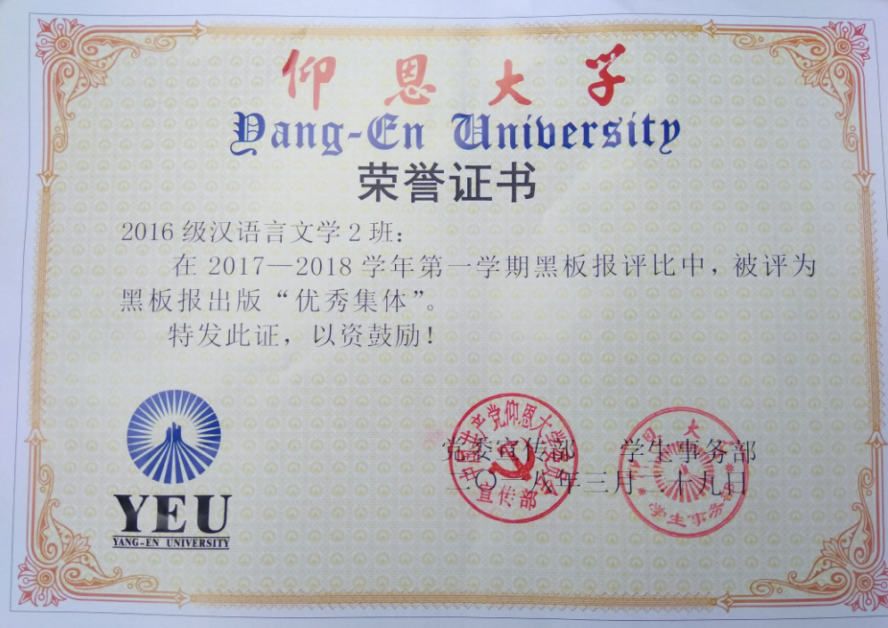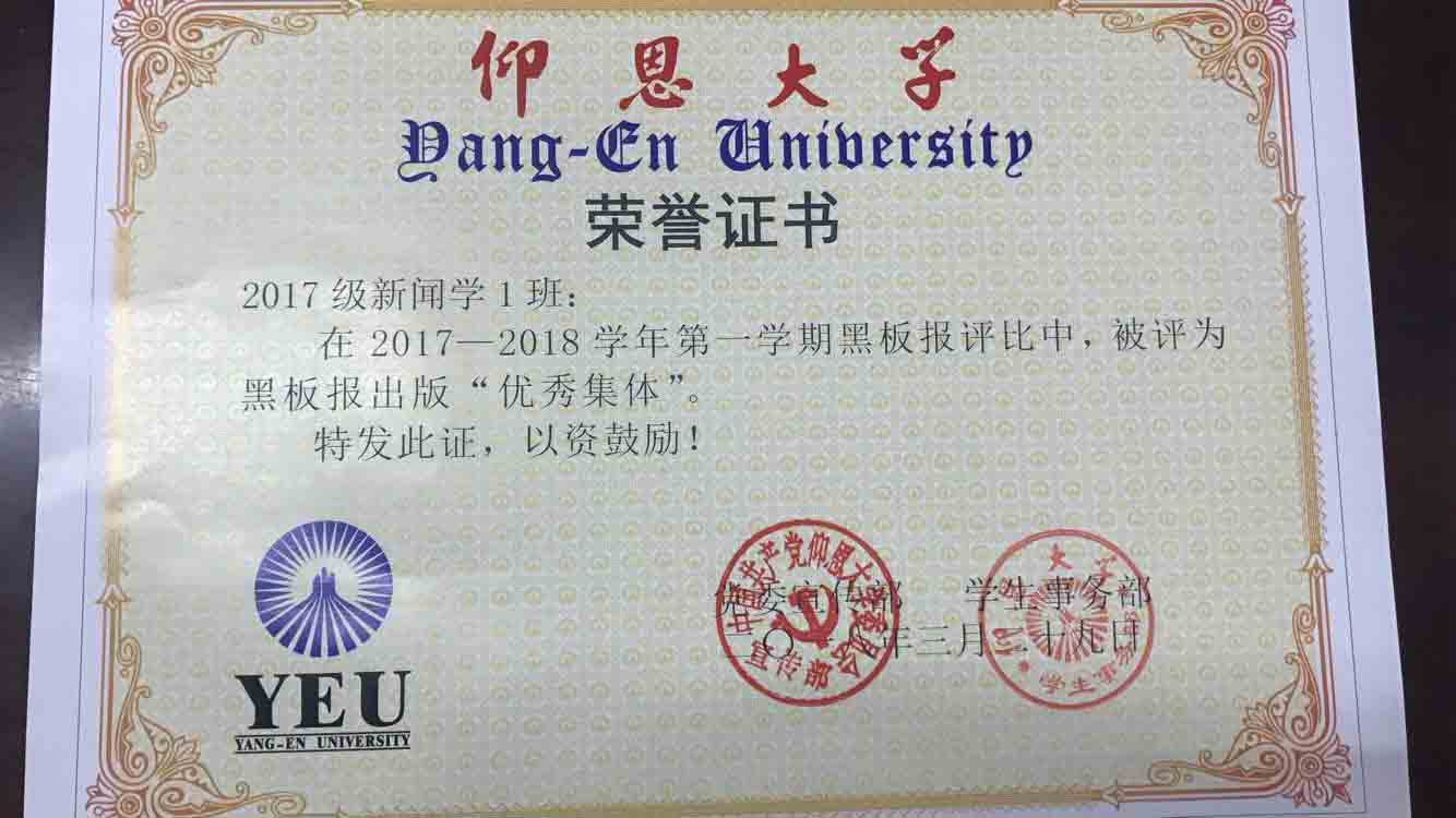 在2017—2018学年第一期黑板报评比中,williamhill英国官网有5个班级被评为黑板报出版“优秀集体”,他们分别是15新闻学1班、15汉语言文学2班、16汉语言文学1班、16汉语言文学2班、17新闻学1班、17新闻学2班、17广告学1班。