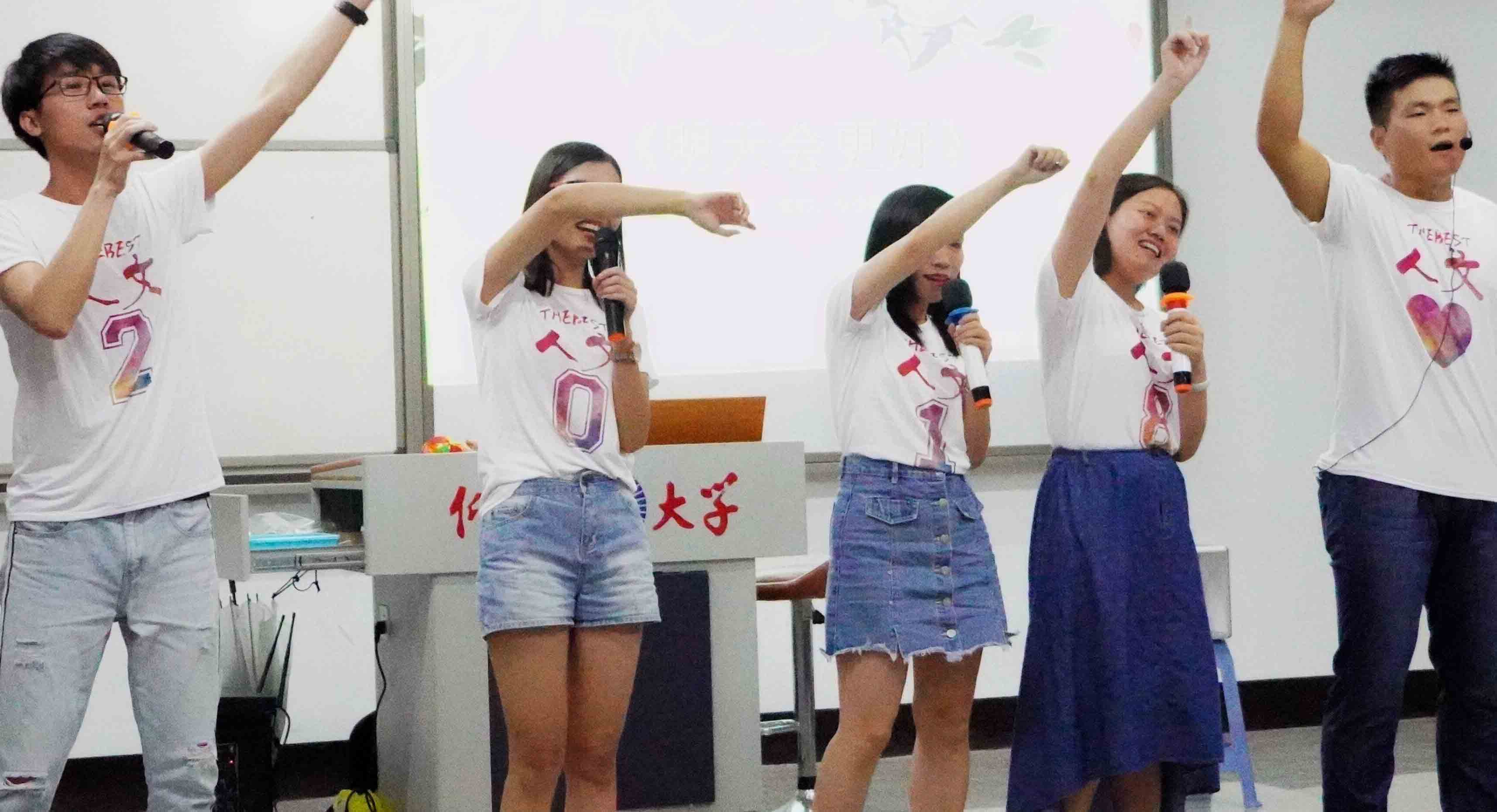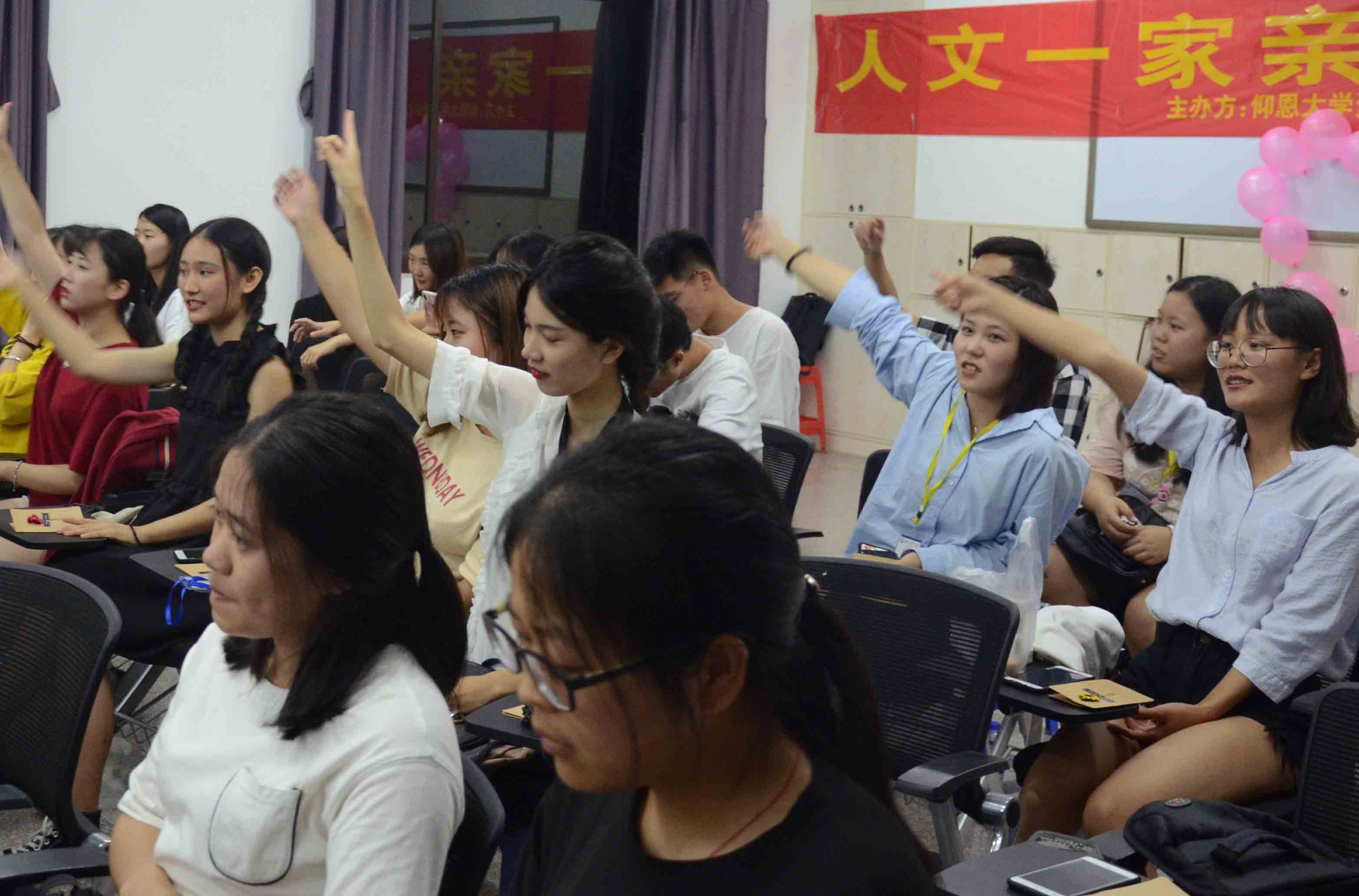 晚会以学生会文艺部的成员带来的《江南+eiei》拉开序幕,他们以甜美的歌声和矫健的舞姿,赢得大家的喝彩。紧接着,凌乐健带来一曲《消愁》,用他独特的嗓音勾起了大家无限的回忆,使得双手不自觉的跟着节拍摇摆。让人意想不到的是刘巧玫、陈峰、朱婷、李少聪和林志荣老师,身着“人文2018”的服装走上台,为大家带来了一曲《明天会更好》以甜美的歌声充分展现了人文风采以及对未来的美好憧憬。现场闪光灯在同学们的手中纷纷亮起跟着摇摆,仿佛自己置身星海。最激动人心的游戏环节是“击鼓传花”,接到花球的同学们接受惩罚,纷纷上台表演才艺,李少聪老师以一首《小幸运》震惊全场。朱婷老师和曹流老师深情演唱了一首《后来》,赢得了热烈的掌声和呐喊声。“心有灵犀”这个游戏环节更是有趣,胡友仁等老师也参与其中,他们的语言和肢体表达赢得了场下阵阵笑声。在“给你真挚祝福”这个环节,大家纷纷在小卡片上为陌生人写下寄语,通过随机抽取的方式将自己的祝福传递出去。最后,此次晚会以一首全体成员深情演唱的《感恩的心》完美落幕。
