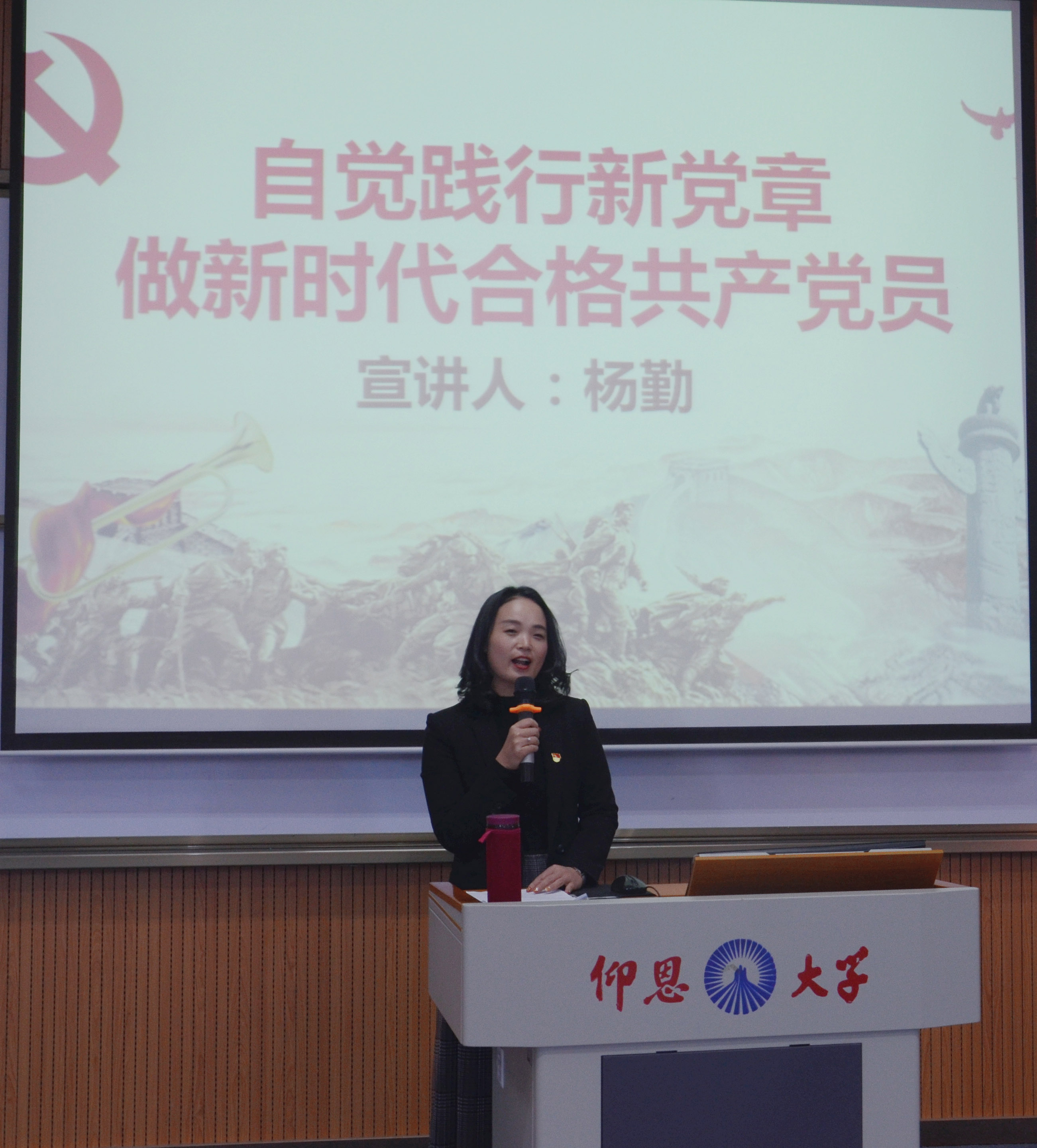 杨勤书记从认识党章的发展历程和重要地位、领会新党章的变化特点和时代意蕴以及努力做新时代合格的共产党员三个方面为大家进行讲解。追溯共产主义运动的本源,详细阐述了党章的修改和发展历程,着重阐明了新党章最大的亮点和创新之处是把习近平新时代中国特色社会主义思想确立为指导思想,对新时代合格的共产党员提出一系列可操作性强的做法。