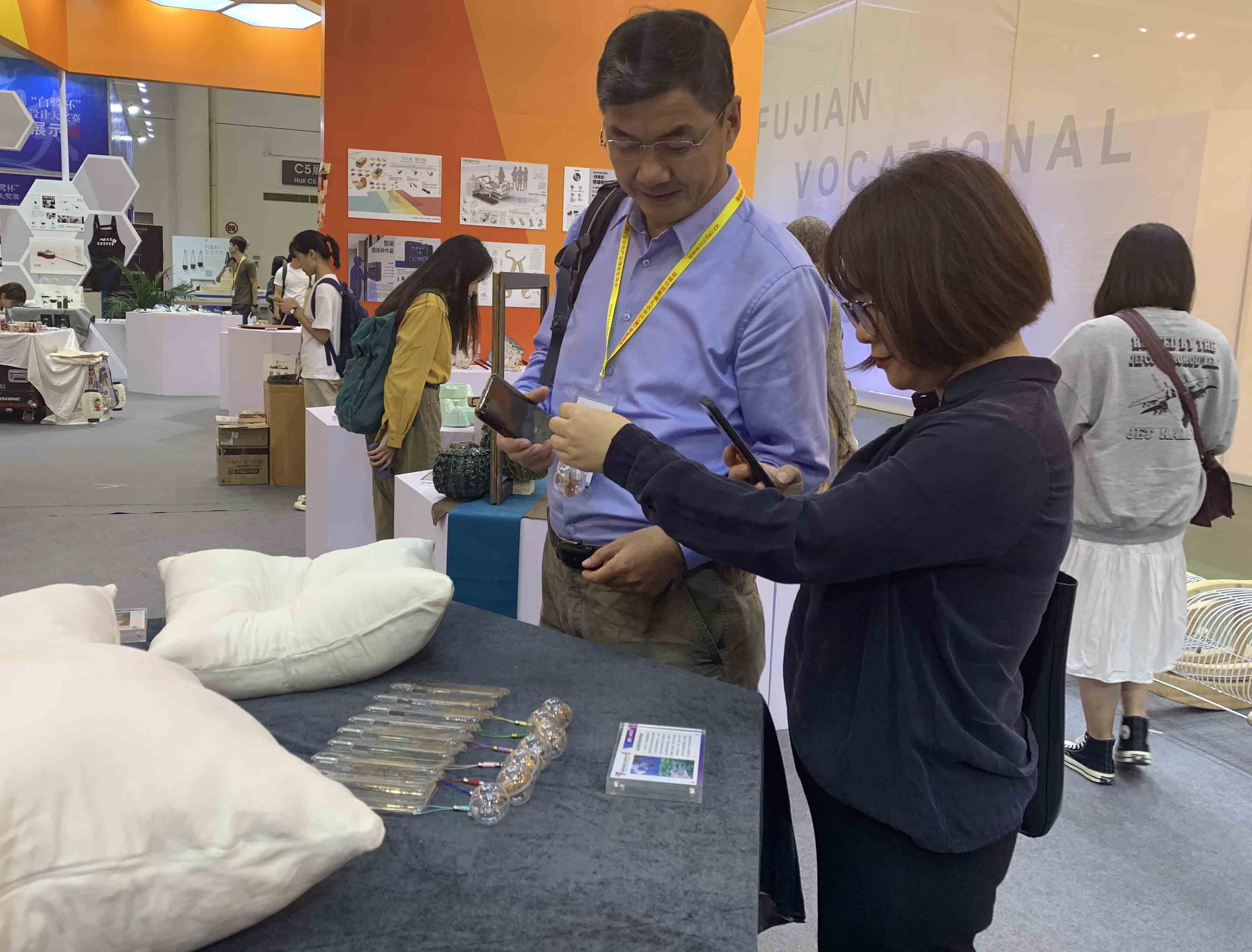 带队老师观看我校学生作品 我校送选的系列作品《番仔楼上的闽南》、《软木画手机壳与吊坠球》,在“2019两岸高校设计展”上展出,吸引了不少领导、嘉宾和观众驻足观看。展示了我校师生近年来在广告文化创意作品开发等方面所取得的成果。