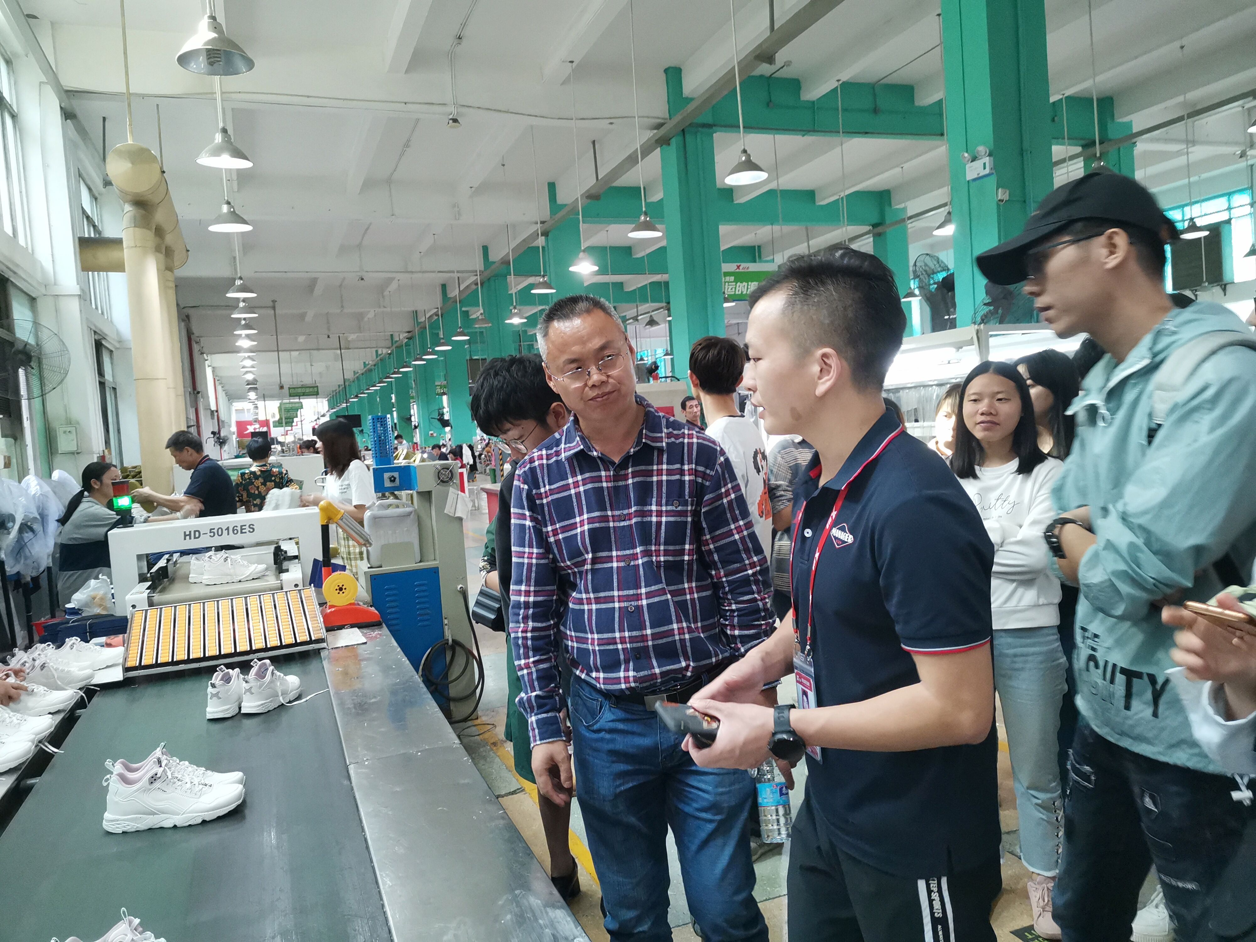 合影留念 我们首先参观了特步生产车间。特步公共关系部吴明海部长热心为我们讲解。我们熟悉了产品从生产到装箱的全过程。一双鞋子经过68个工序,就可以成型出厂。车间拥有45条国际领先的针车流水线,12条成型流水线。车间工作人员精益求精一丝不苟,确保各个环节生产质量。通过观看生产线,我们对产品的生产流程与质量管理留下了极为深刻的印象。