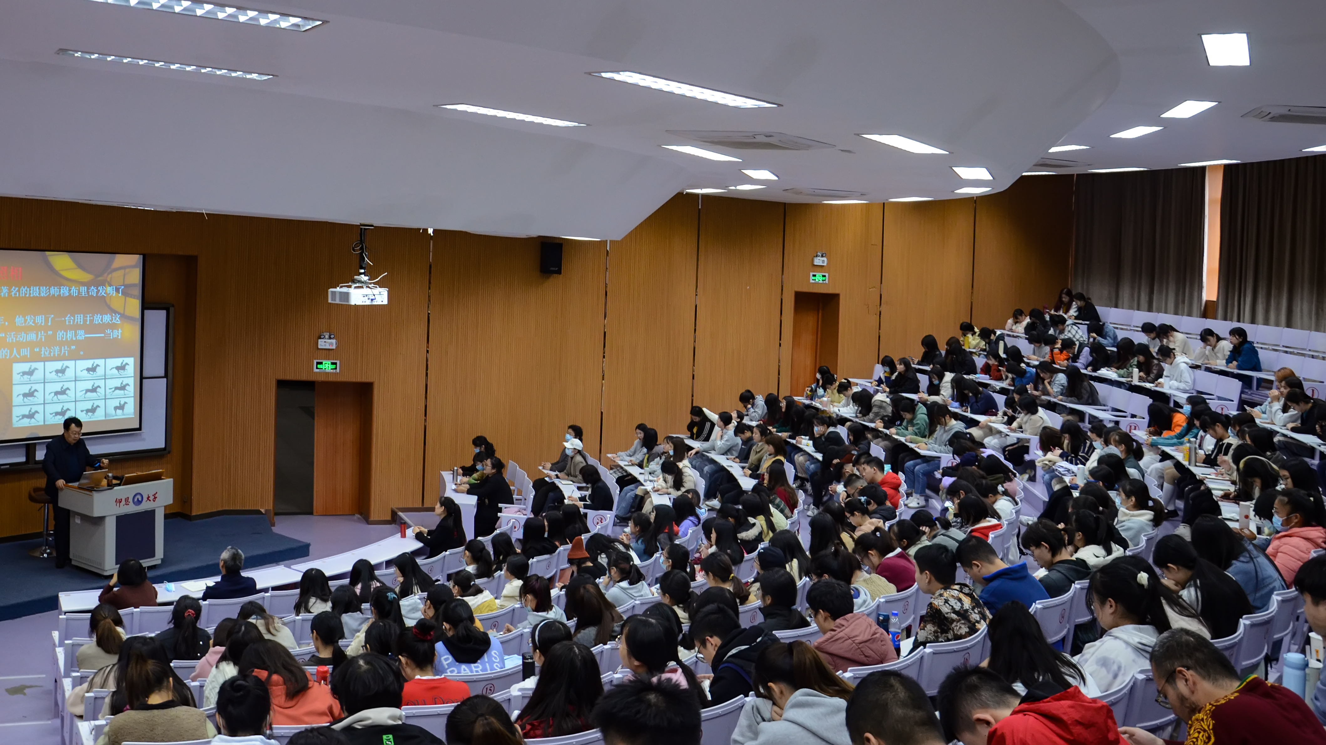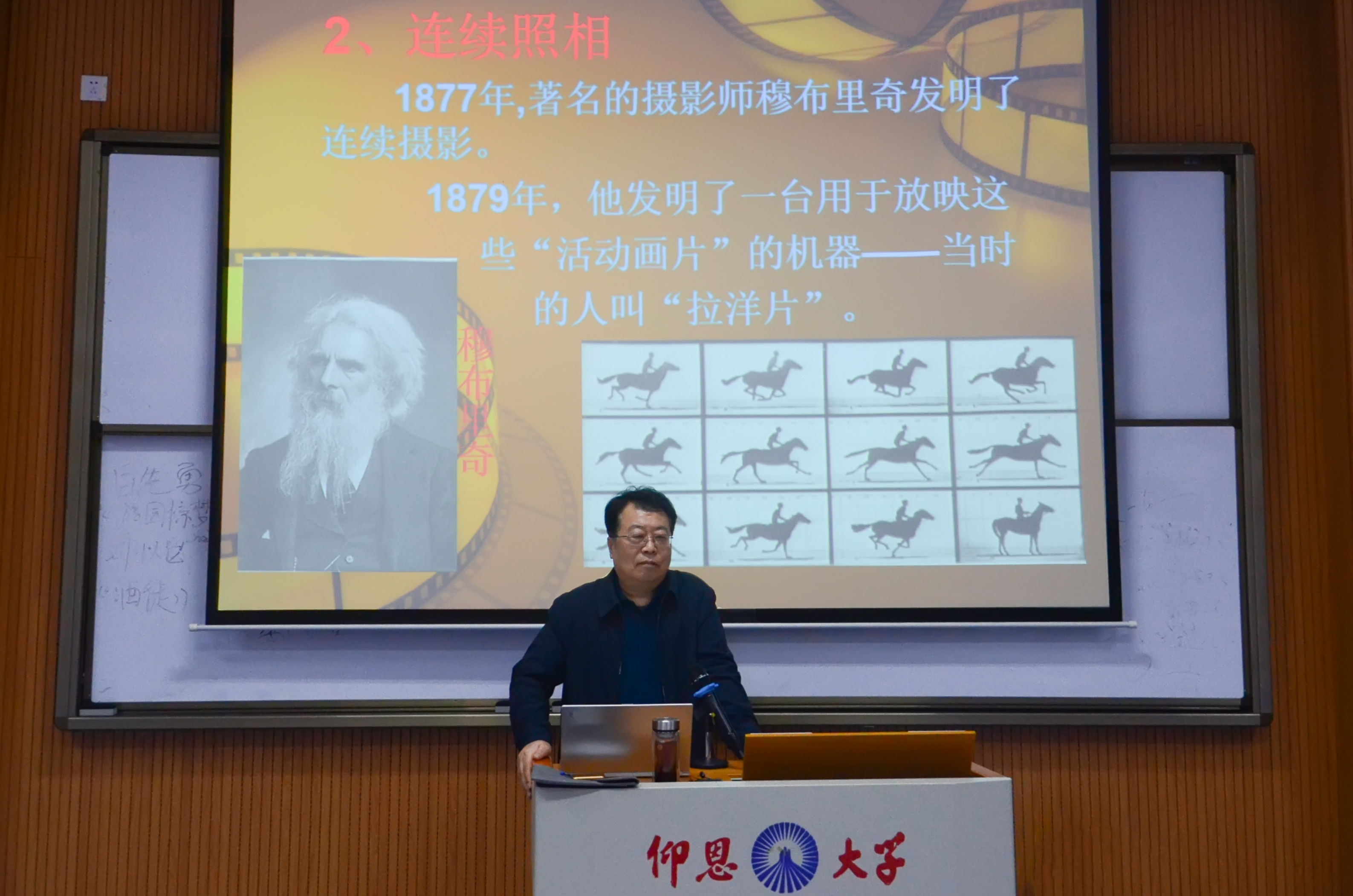 讲座伊始,魏杨青教授首先阐释了电影的内涵,即电影是一门讲故事的叙事艺术,是一门代言体艺术。他带领我们回顾了电影的诞生与发展,向我们讲起照相机、摄影机、移动电影机问世背后的故事。他还讲到著名的穆布里奇发明的连续摄影;爱迪生实验室推出的世界上第一台电影摄影机;法国卢米埃尔兄弟受到缝纫机的启发,发明的移动电影机;还有对电影的发展产生过重大意义的蒙太奇、有声电影、彩色电影等。