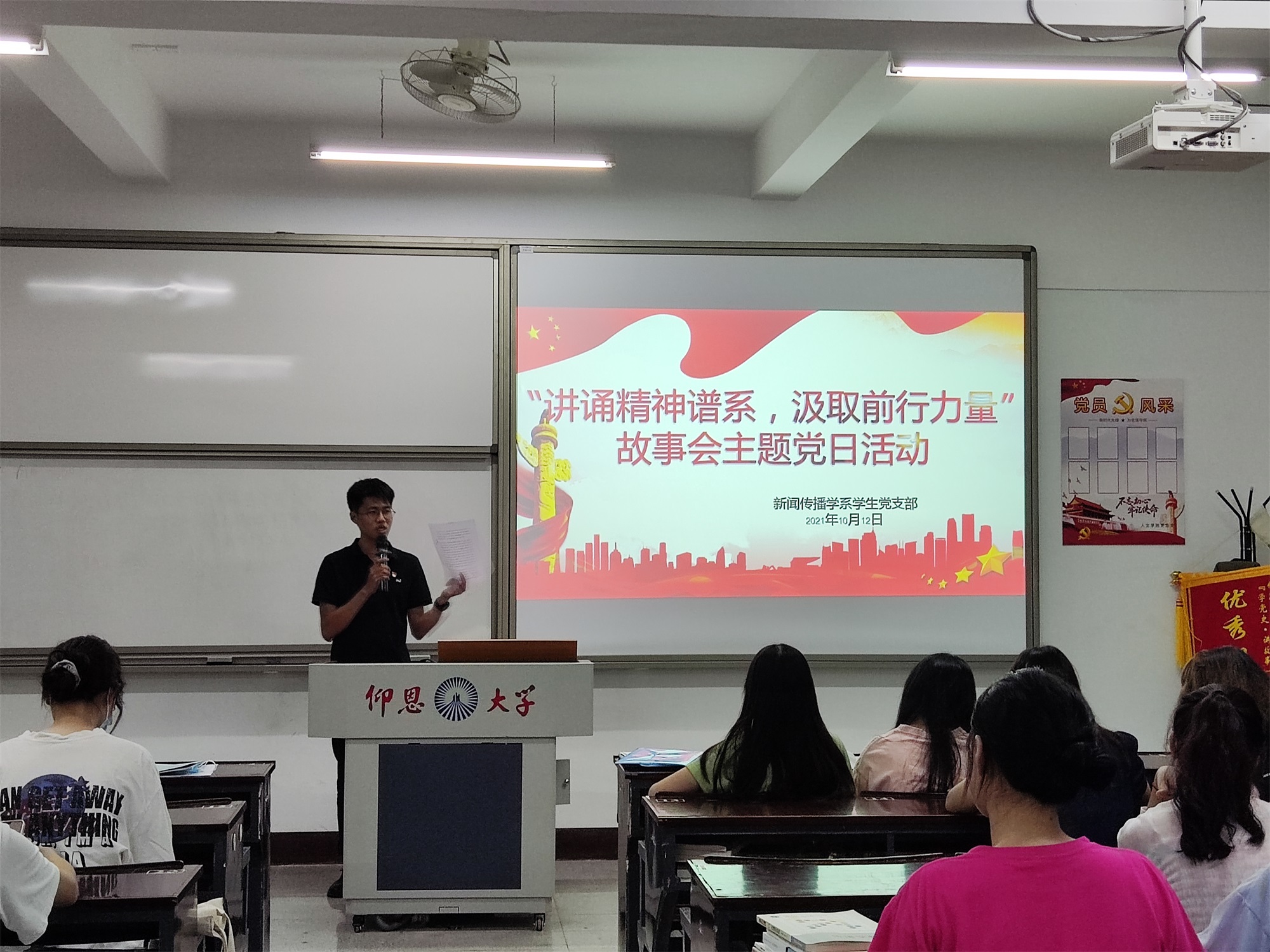 10月13日晚,为引导大学生党员传承红色基因,赓续奋斗精神,朝着党的路线指引,新闻传播学系学生党支部于仰恩楼C1-303开展“讲诵精神谱系,汲取前行力量”故事会主题党日活动。活动出席人员有支部书记王勇浜老师以及新闻党支部全体学生党员。