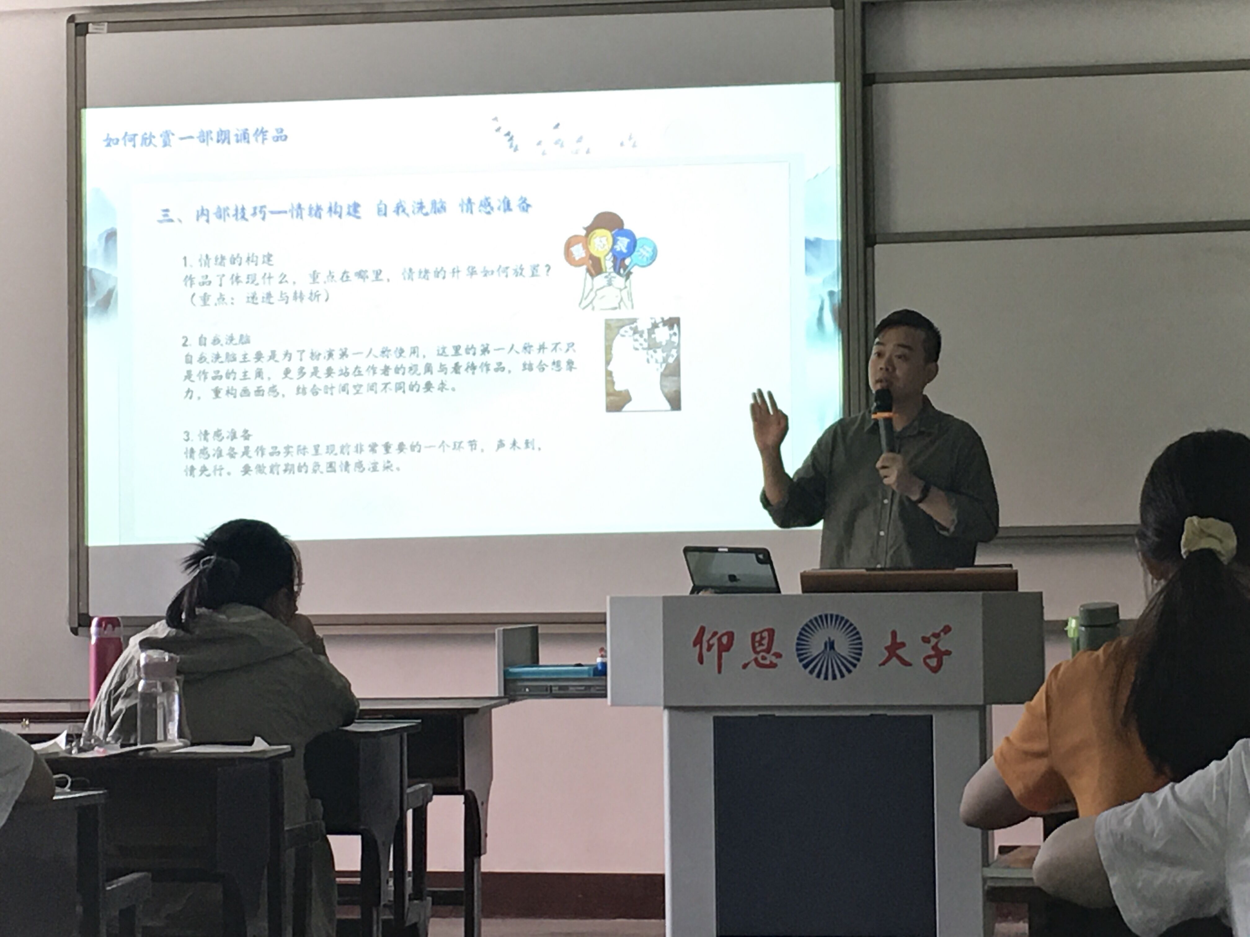 课上,陈俊晔老师带领同学们回顾了口部操的做法。在进行简单的嘴部活动之后,陈俊晔老师结合第十七届齐越节朗诵作品《少年中国说》,给同学们介绍了优秀朗诵作品的构成要素。在课堂互动环节,陈俊晔老师引导同学们将同样的话语代入不同情境,以体会情感氛围对于演讲情绪的影响。