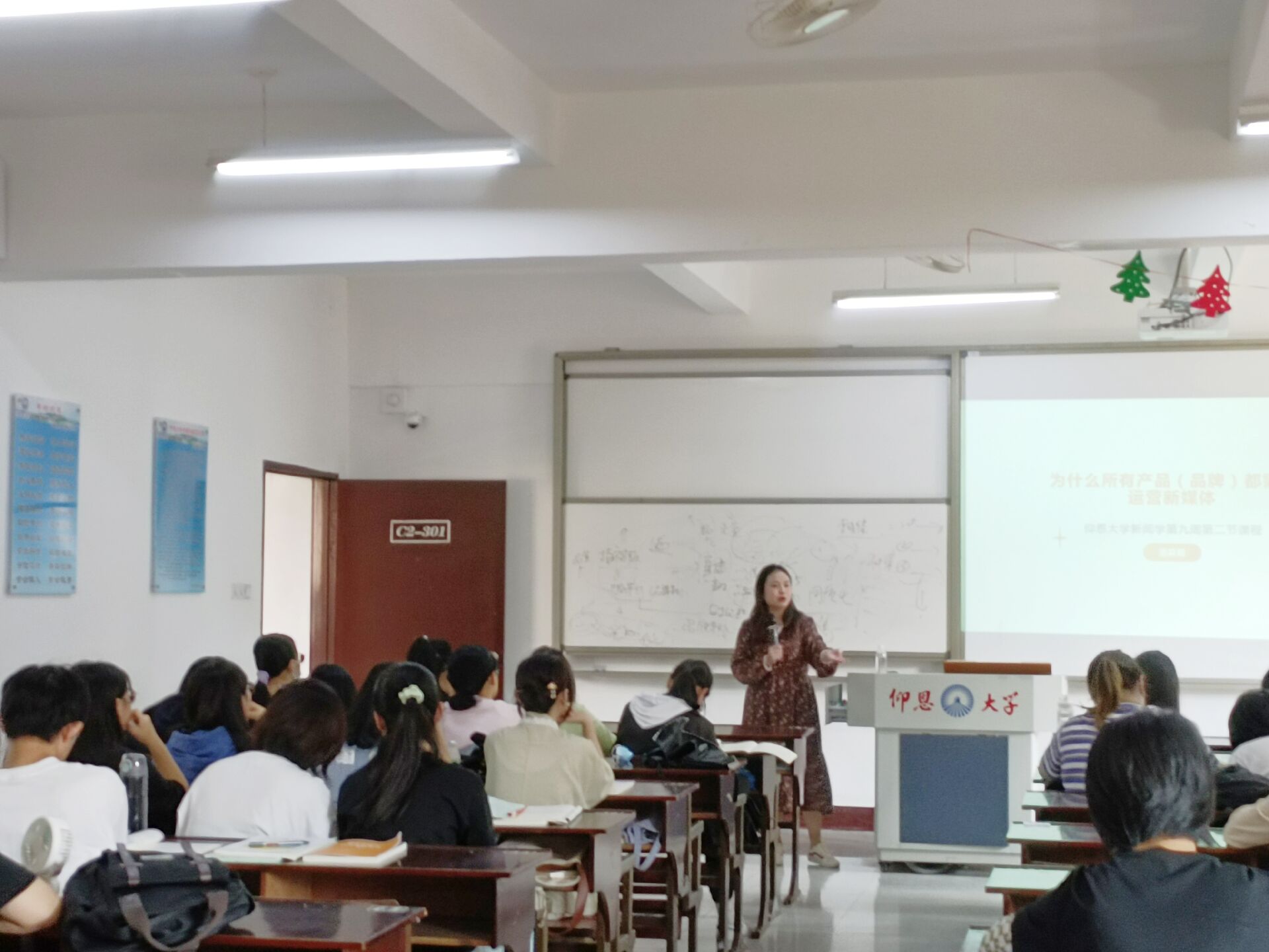 上课内容精简实用,大家纷纷将要点记下互相讨论学习。面对老师的提问,同学们都积极参与回答,讲出自己的看法,整个课堂气氛轻松愉快。最后,老师提出新媒体运营的重点之一是内容,以及内容营销需要多渠道,比如借助抖音、直播、小红书等渠道。提及“当下创作同质化问题”池莉莉老师表示新媒体创作应该注重创新,方能长久发展。