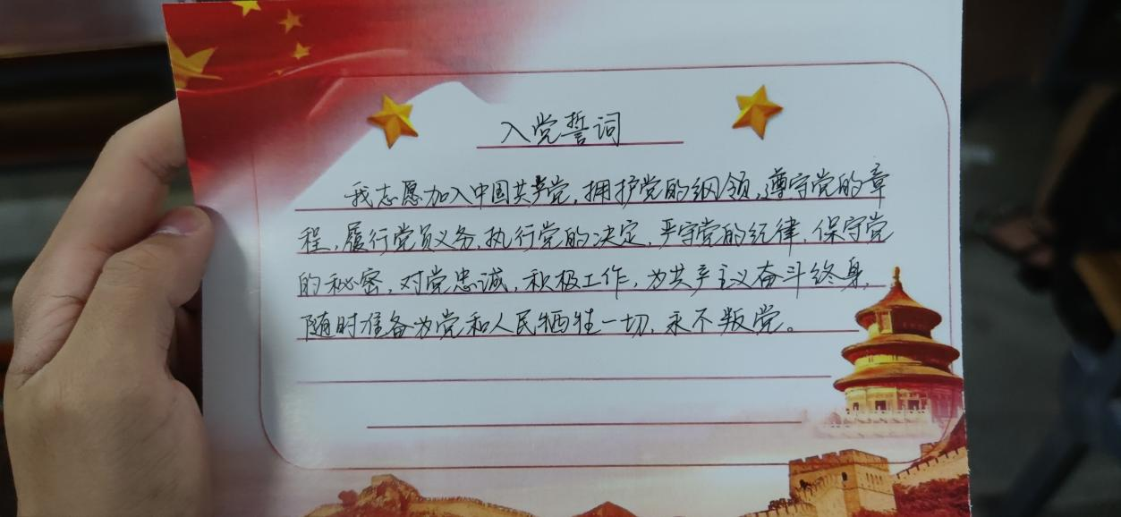 1982年9月召开的党的十二大首次把入党誓词作为一条写进了党章。入党誓词是党组织对党员的基本要求,也是党员对党和人民做出的庄严承诺和保证,更是全国六千多万党员共同的行为准则。支部全体党员通过学习并抄写入党誓词,针对活动主题热烈地展开了深入的讨论,踊跃各抒己见。活动强调支部全体党员应对党忠诚,有为共产主义奋斗终身的觉悟,永不叛党。