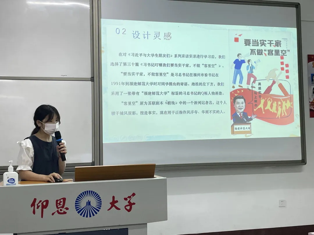 活动现场,新闻传播学系学生党支部书记王勇浜同志首先分享了自己学习《习近平与大学生朋友们》系列访谈实录的心得体会,然后其他党员同志依次上台进行分享。阮怡静、林琳欣、叶秀青同志制作的海报整体色调以红色与白色相交融为主,象征着积极向上的红色教育。背景融入的“锤头”、“螺丝刀”、“以实干,定前行”等元素,展现了爱岗敬业、任劳任怨、无私奉献、埋头实干的形象。吴梦凡、林佳雯同志在海报中加入了不同的大学生形象,表达大学生的爱国,励志,求真,力行的精神。陈钰洁、林雅雯同志制作的海报选取习近平主席与大学生一起交流的图片进行彩绘制作,展现大学生风采。陈玉莲、胡雅婷的海报融入了天安门、国旗以及军人的元素,表现了红色的革命精神和五四精神。颜宁静、李绚同志制作的海报表现了习近平总书记对西安交通大学的大学生朋友们继续传承弘扬西迁精神,不忘初心、牢记使命,不负党和人民的深切期望。吴姗姗、杨圭銮同志所制作的海报以蓝色为主色调,结合和平鸽作为海报背景,象征着当代大学生的青春与活力。