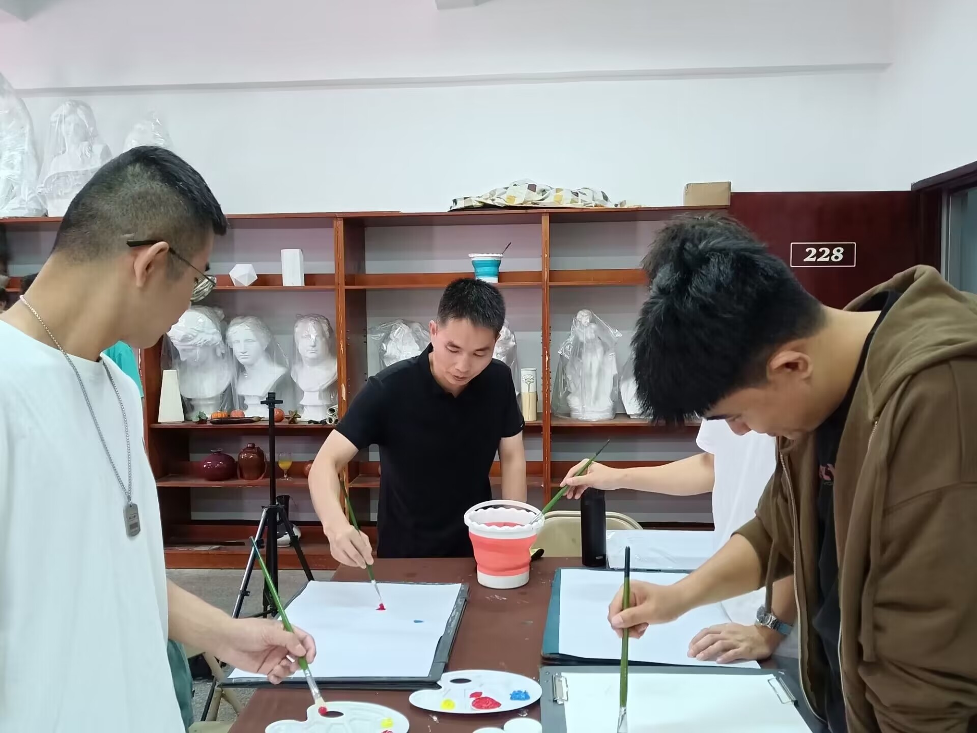 苏一森老师在课上指导学生实践 苏一森老师通过对颜色的认识角度,从色彩的三要素、色彩的搭配、色彩的对比以及色彩的心理感觉四个方面入手,亲身示范,向同学们传授了调色的基础和画画的技法,同时结合自己多年来的绘画经验向同学们提供了一些技巧。
