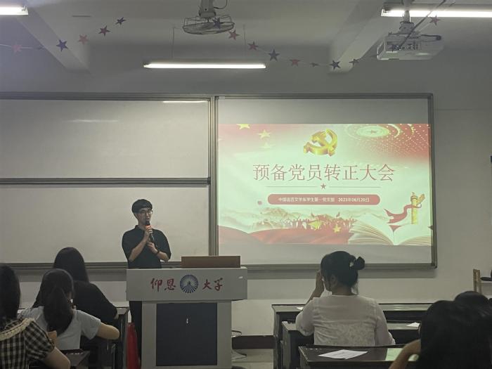 中国语言文学系学生第一党支部于6月20日晚上20:00在仰恩楼B1-201召开预备党员转正大会,支部全体党员及预备党员参加了本次会议。