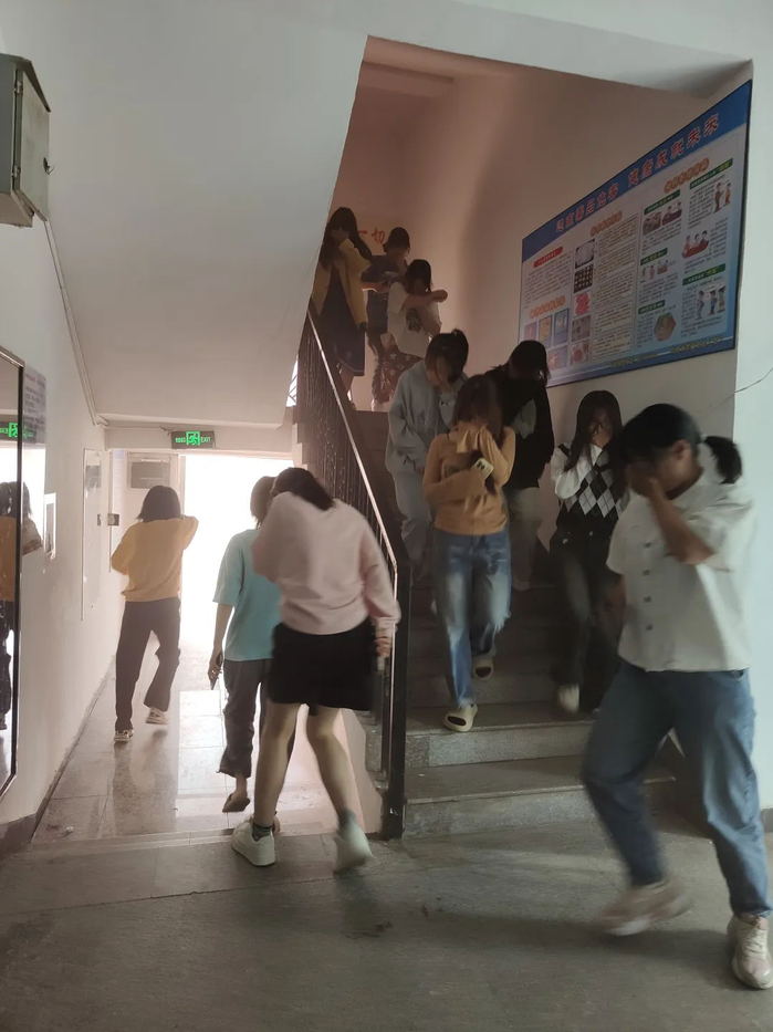 演练开始后,嵩山楼驻楼辅导员赵潇潇、韩萍发现火情,立即启动学生社区楼栋消防疏散处置流程,由赵潇潇使用对讲机呼叫校园110报告火情,韩萍使用扩音器呼喊引导学生以最快的速度从安全通道撤离宿舍。