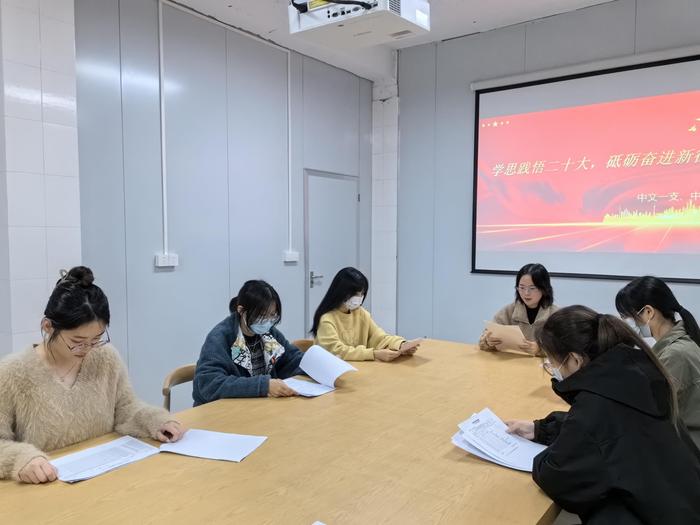 为深入学习宣传贯彻党的二十大精神,推动习近平新时代中国特色社会主义思想不断往深里走、往实里走、往心里走,提高学生思想道德修养,强化学生责任意识和使命担当,2023年12月4日晚7点,中文系学生第一、第二党支部在致远书院党员活动室召开“学思践悟二十大,砥砺奋进新征程”主题教育活动,活动由中文二支书记谢云同志主持。本次活动以学习党的二十大精神为根本,强调学以铭志、学以明理的重要性。