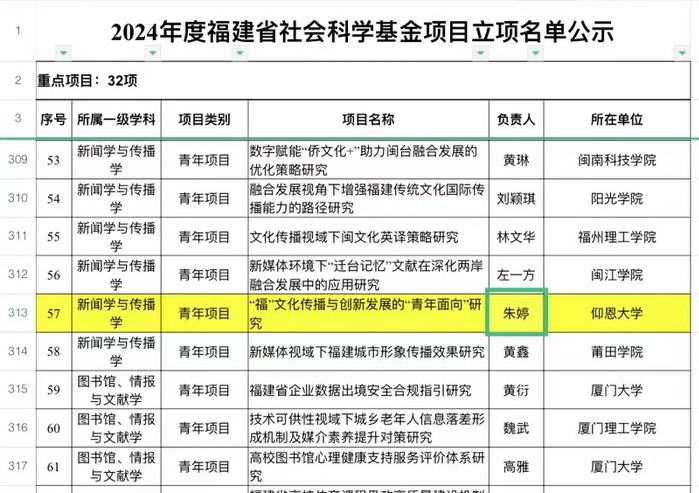 近日,2024年福建省社会科学基金项目立项名单公示,williamhill教师朱婷所申报的《“福”文化传播与创新发展的“青年面向”研究》获得立项。