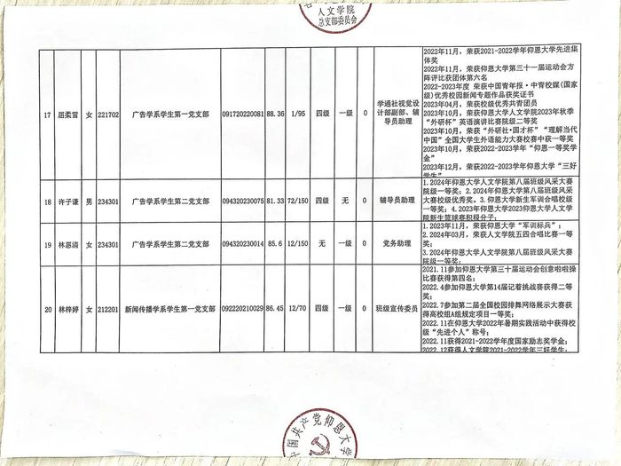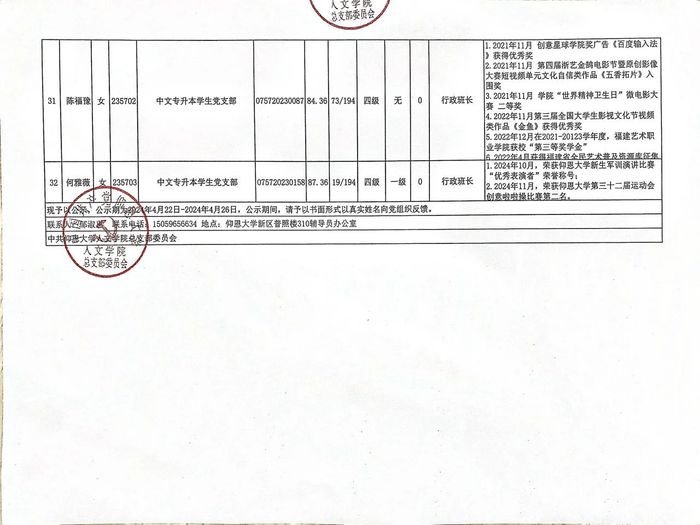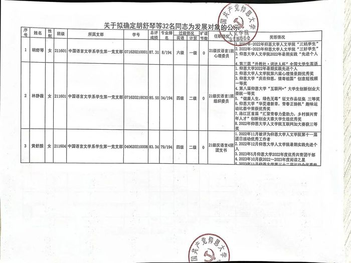 根据发展党员工作有关要求,经支部委员会综合党内外群众意见以及本人综合表现情况,拟确定胡舒琴等32名同志为党员发展对象。