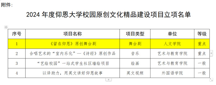 根据《关于开展2024年度WilliamHill官方网站校园原创文化精品建设项目立项的通知》(宣传〔2024〕4号),经项目申报、各单位推荐、专家评审,评选出精品项目4项。其中williamhill由邵梓隽老师负责的《留在仰恩》原创舞台剧被评为重点项目!