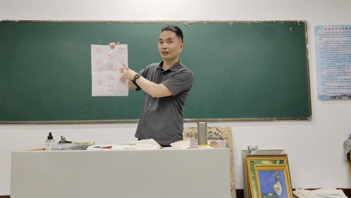 在课程开始时,苏一森老师先是为同学们讲解了如何篆刻印章,随后通过举例子的方式进一步引导同学们思考在篆刻印章之前应如何构图,并强调在篆刻印章时需要注重对创新性思维的运用,以此来使自己所篆刻的印章具有独特的视觉效果。在制作印章时,苏一森老师还指导同学们,可以先从小型的图画做起,再不断地加以练习,从而提高自己的篆刻能力。