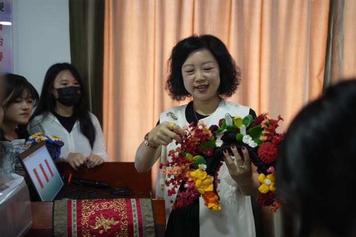 本次非遗主题沙龙以流传至今的海丝技艺——泉绣为主要内容,主要讲授了珠绣、金仓绣、白绣三种绣法。吴丹对泉州白绣、清代盘金绣等绣品样品进行展示以及对绣品的细节进行了详细的讲解,让同学们对泉绣有了更深刻的了解。在互动环节,同学们向吴丹展示了手作簪花围作品,吴丹老师对同学们的作品给予了高度的评价以及相对的建议。现场气氛热烈,同学们踊跃参与其中。在讲座后,同学们与吴丹老师展开了交流讨论。通过师生彼此的交流,同学们对于非遗泉绣有了更进一步的思考。