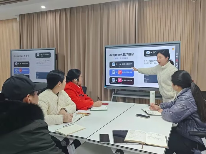 同时,本次会议上由实验室谢日菲老师带领三位学院秘书将深度求索(DeepSeek)等生成式AI工具引入日常办公中,旨在借助AI智能化应用提升工作效率,推动学院各项事务高效运转。如撰写通知、报告时,借助其智能生成文本框架,提高写作效率;处理数据时,运用数据分析功能挖掘关键信息,增强工作科学性。同时,它能对复杂的学生成绩数据、教师教学评估数据等进行高效分析,为决策提供有力依据。还能优化信息检索功能,秘书们查找教学资料、学生档案信息时更便捷。通过AI赋能的工作模式,探索DeepSeek等相关AI工具在文件整理、会议安排等工作流程中的应用,熟练掌握操作技巧,实现工作效率和质量的提升。