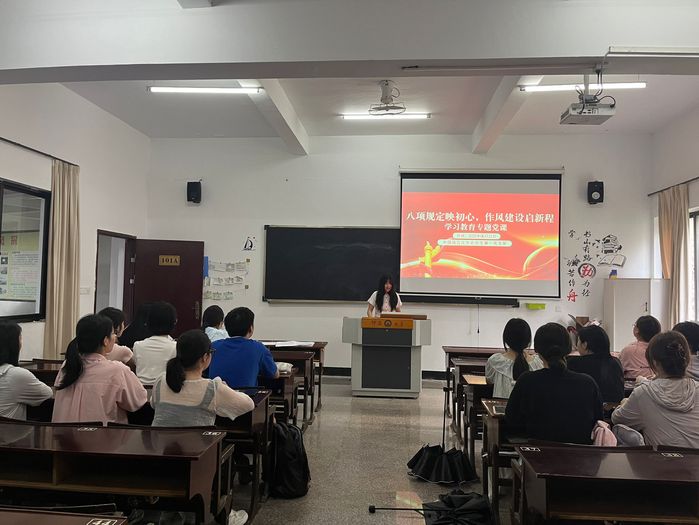 2025年6月11日,中国语言文学系学生第一党支部于普照楼101A开展“八项规定映初心,作风建设启新程”专题党课,深入贯彻中央八项规定精神学习教育。支部书记赵潇潇主持本次专题党课。