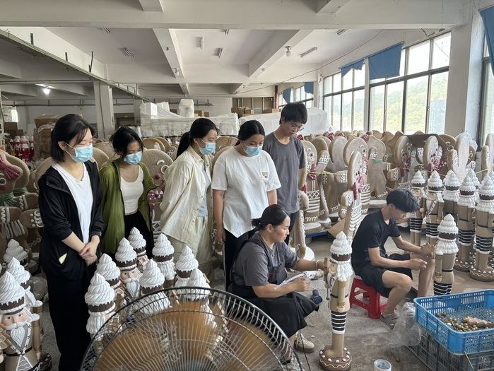 活动现场,实践队员们围绕在工艺师傅的身旁,专注学习姜饼人、胡桃夹子等工艺品的制作。活动伊始,师傅先讲解制作要点,如何用热熔胶对工艺品进行拼合和加固,以及在动手操作过程中要注意的相关事项。从材料拼接到造型塑造,工艺师傅把每一个步骤都讲述得细致入微。