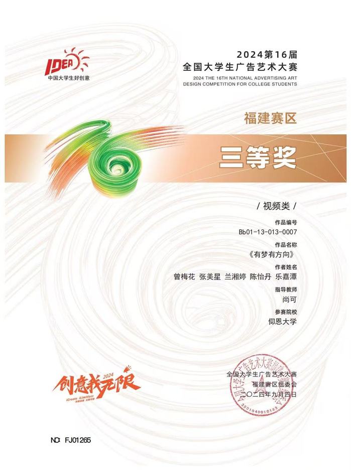 3.未来设计师全国高校数字艺术设计大赛:省级一等奖1项;二等奖1项;三等奖1项