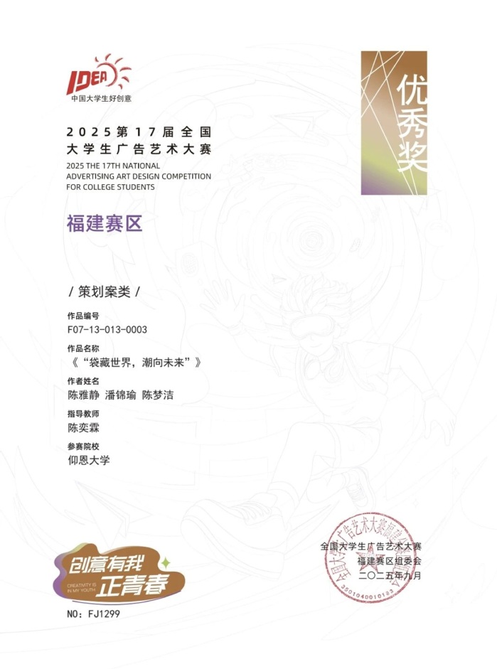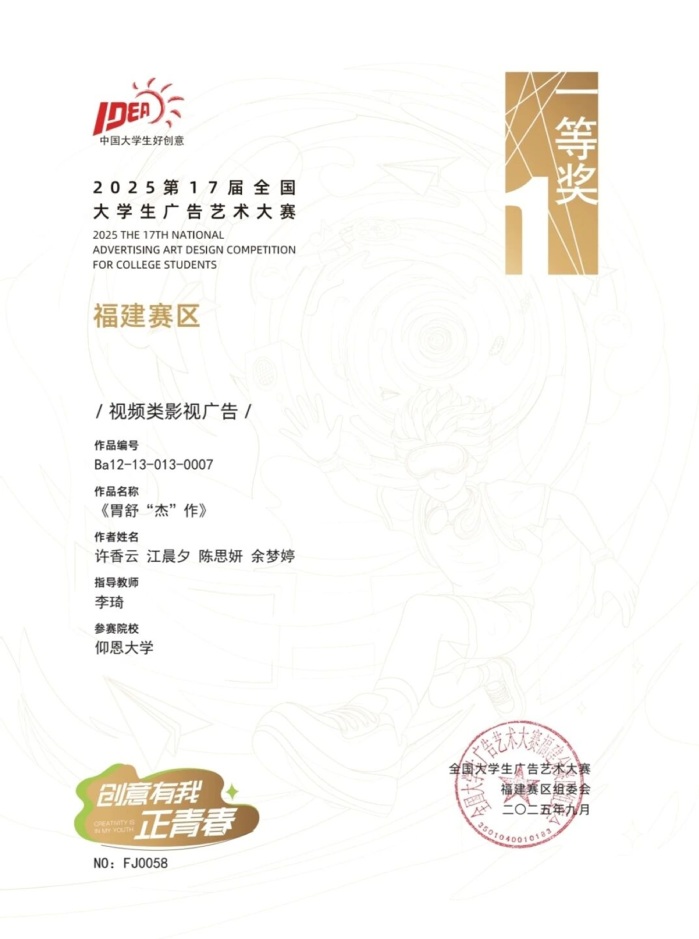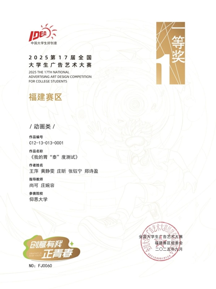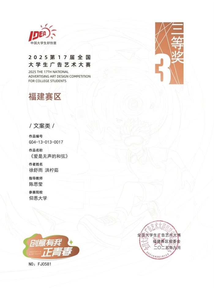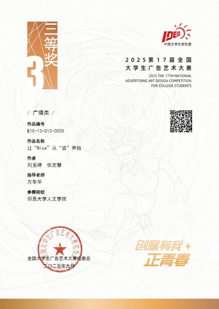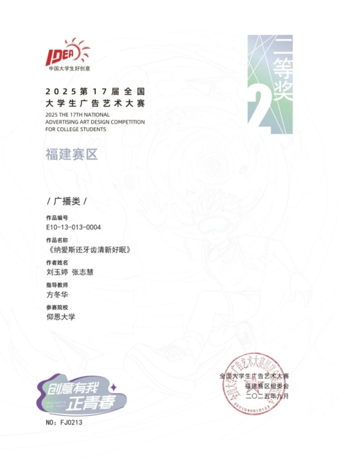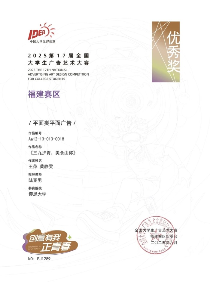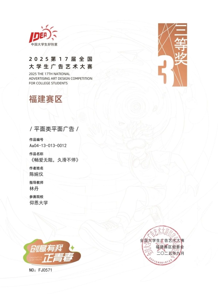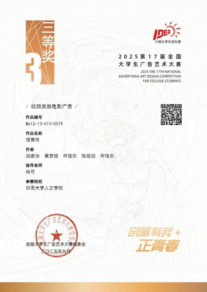 本届大赛中,williamhill参赛作品涵盖了平面设计、影视、动画、广播、文案、策划案等多个类别,充分体现了williamhill学生在广告创意、设计表达等方面的综合素养与实践能力。以下是部分获奖者证书展示: