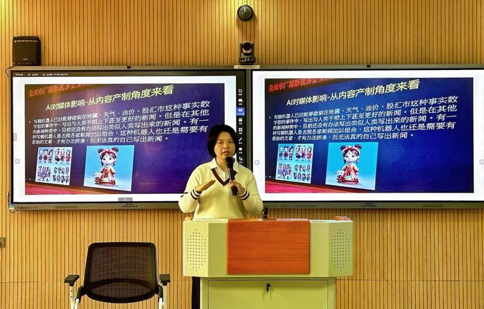 黄丹老师的分享聚焦于融媒体技术发展的最前沿。她深入介绍了在挂职期间接触与研究的数字虚拟人主播等人工智能应用。作为AI技术在新闻播报、内容生成领域的具体实践,虚拟人主播正逐步走向常态化应用。黄老师认为,此类前沿技术的引入,不仅改变了传统内容生产模式,也对未来传媒人才的技术素养提出了新要求。她计划将相关技术逻辑、应用场景及其背后的伦理思考融入教学,启发学生探索“技术+内容”的无限可能。